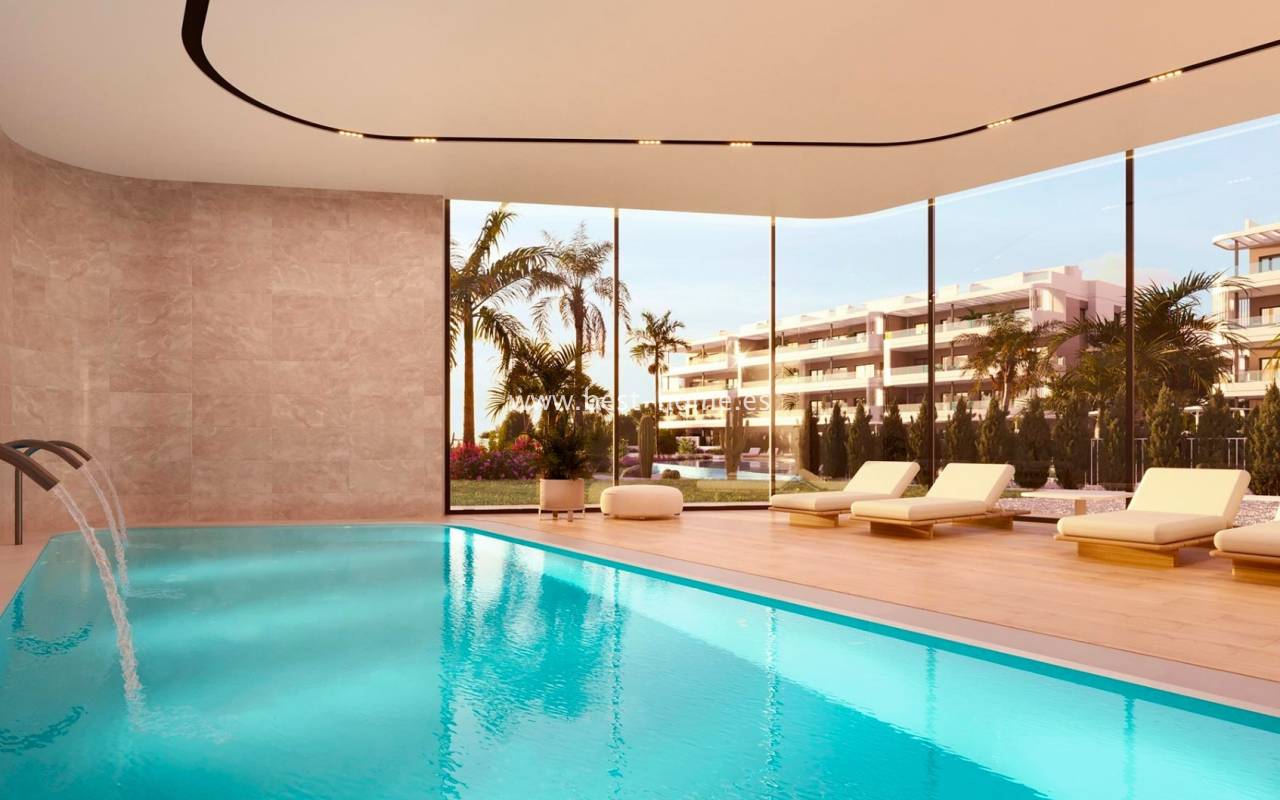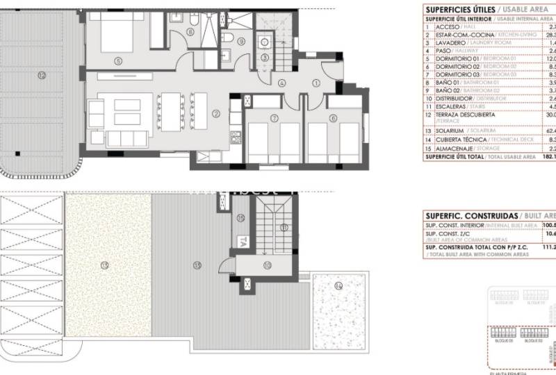 Nowe osiedle składające się ze 172 apartamentów budowane jest w dobrej, spokojnej lokalizacji w Torrevieja. Dostępne są apartamenty typu penthouse z 3 sypialniami, 2 łazienkami, pralnią, umeblowaną kuchnią z barkiem połączoną z jadalnią i salonem. Z głównej sypialni i salonu będzie wyjście na taras o powierzchni m2. Z tarasu będą ładne widoki na części wspólne. Wewnętrznymi schodami dostaniemy się na solarium/taras na dachu (62 m2). W cenie zabudowa kuchenna, wykończone łazienki, pre-instalacja centralnej klimatyzacji, podgrzewane podłogi w łazienkach oraz miejsce parkingowe i komórka lokatorska w podziemiach budynku. Na terenie zamkniętego osiedla będzie kilka basenów (dla dzieci i dorosłych), wspólne ogrody z bujną roślinnością, siłownia, strefa spa, sauna, zewnętrzna siłownia, korty do gry w padel i place zabaw.