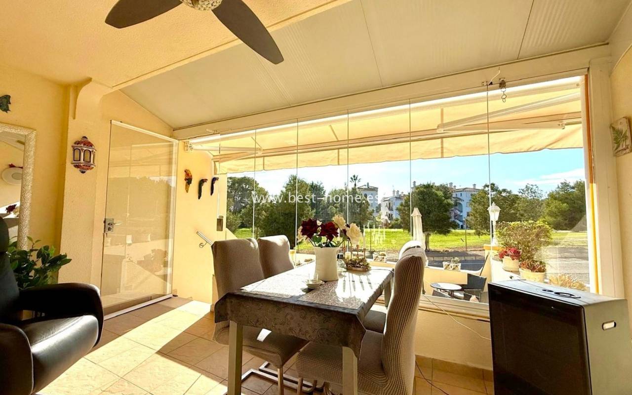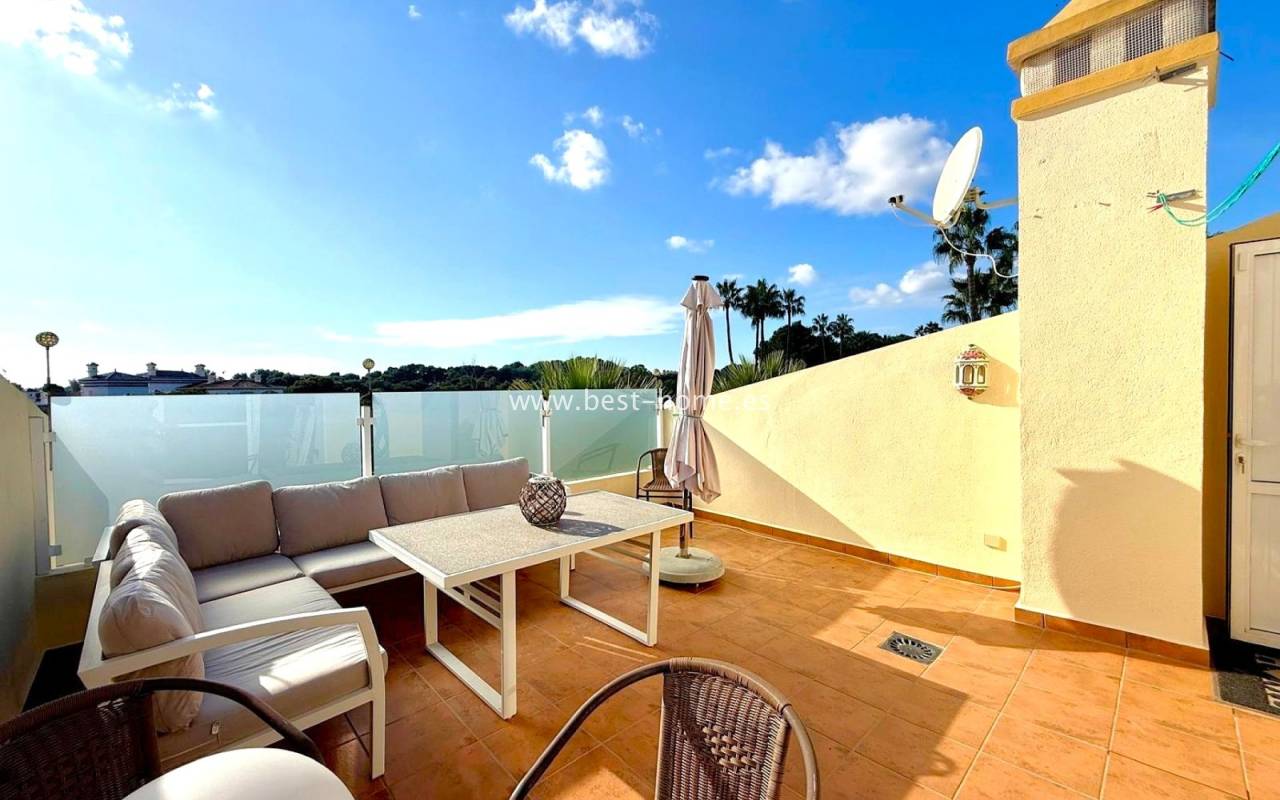 Fantastyczny dom szeregowy położony przy polu golfowym Villamartin. Nieruchomość składa się przedniego, słonecznego ogródka, następnie jest zabudowany taras wejściowy/jadalnia, salon z kominek, umeblowana kuchnia, toaleta i pomieszczenie gospodarcze. Na piętrze są dwie sypialnie (główna z wyjście na taras) i łazienka. Piętro wyżej odnajdziemy solarium/taras, gdzie jest zrobiona trzecia sypialnia. Dodatkowo jest tylny ogródek. Dom zadbany, słoneczny z ładnymi otwartymi widokami. W cenie umeblowanie, kominek, marmurowe podłogi, sprzęt AGD i klimatyzacja. Basen dla mieszkańców. Bardzo dobra lokalizacja do centrum handlowego Villamartin Plaza, gdzie jest mnóstwo restauracji i barów dojdziemy w 4 minuty.