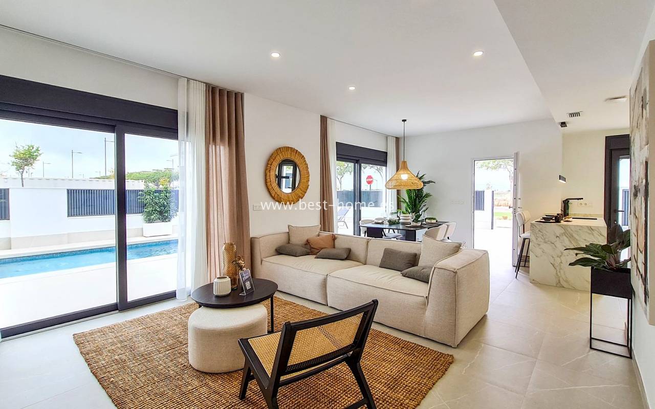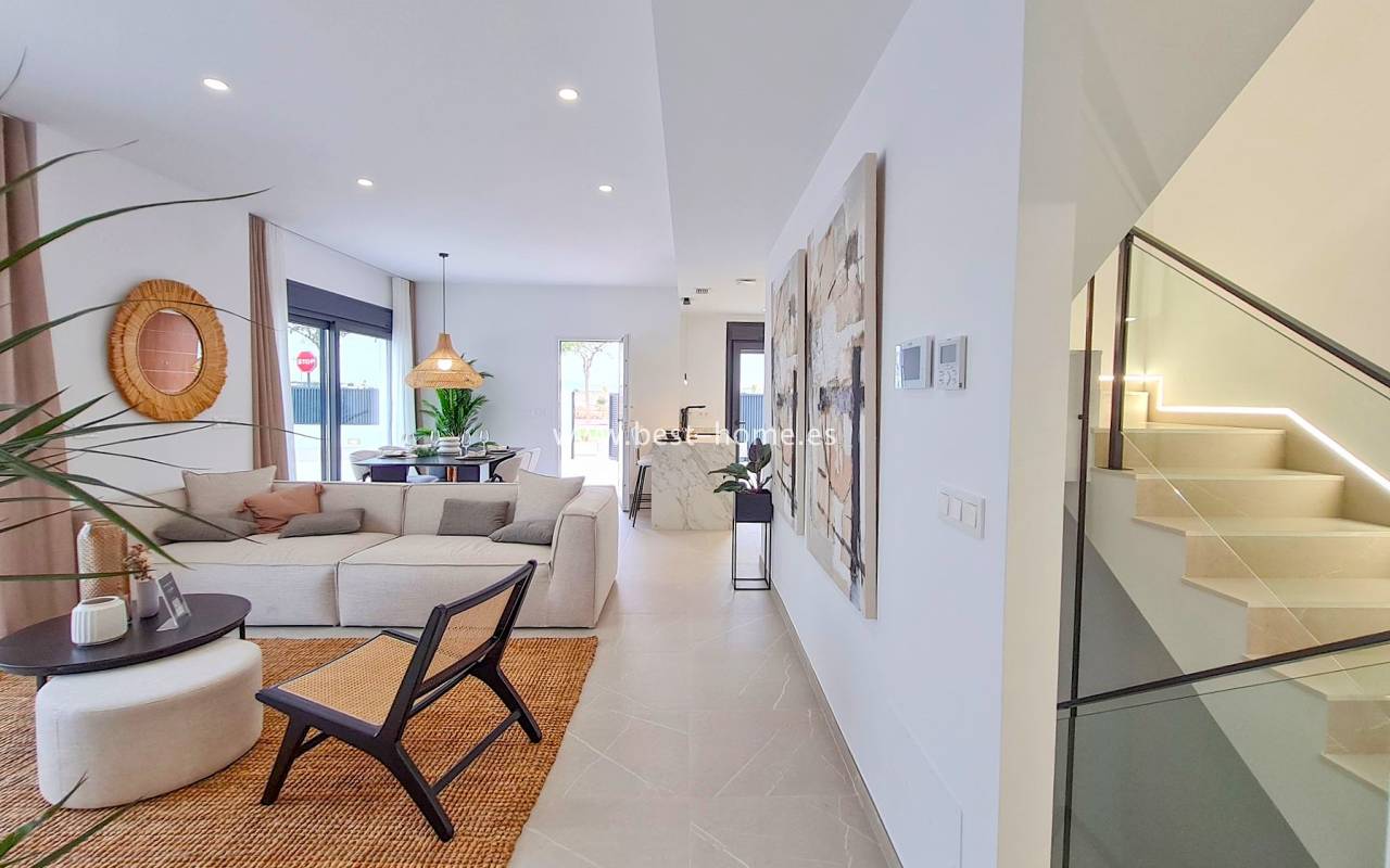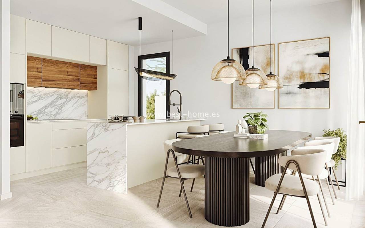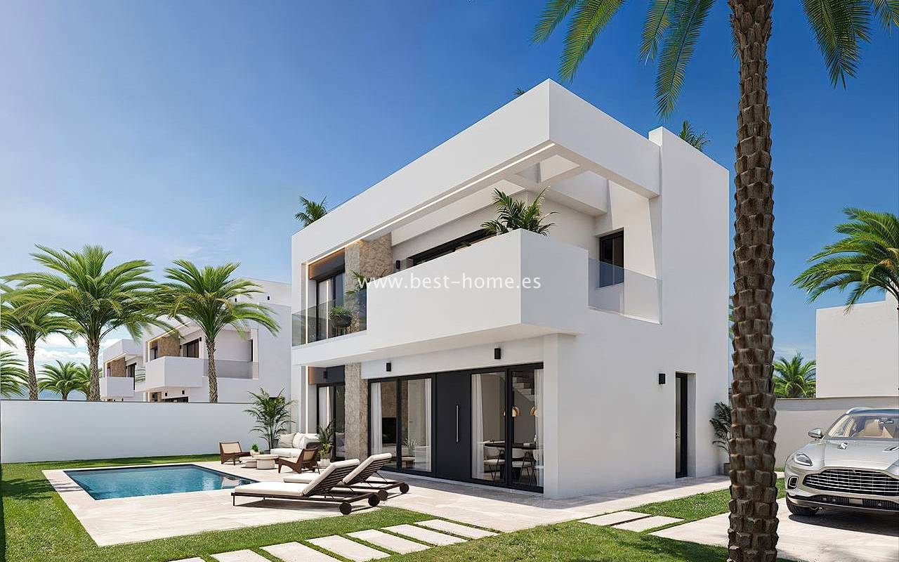 Nowe, luksusowe wille budowane są w tym niesamowitym miejscu. Na parterze będzie przestronny i jasny salon połączony z jadalnią i umeblowaną kuchnią, jedna sypialnia i łazienką. Ze wszystkich pokoi będzie wyjście do ogrodu. Na piętrze odnajdziemy kolejne dwie sypialnie z łazienki en suit i taras. Kolejnymi schodami dostaniemy się na solarium/taras na dachu o powierzchni 33 m2. Z salonu dostaniemy się podpiwniczenia (61 m2) z wyjściem na patio (25 m2). W cenie zabudowa kuchenna wraz ze sprzętem AGD, elektryczne rolety zewnętrzne, dekoracyjne oświetlenie (schody, szafy, kuchnia), kompletne łazienki, podgrzewane podłogi w łazienkach, prywatny basen (z jacuzzi) ze słoną wodą, panele fotowoltaiczne i pre-instalacja centralnej klimatyzacji. Działki od od 252 m2 do 341 m2.