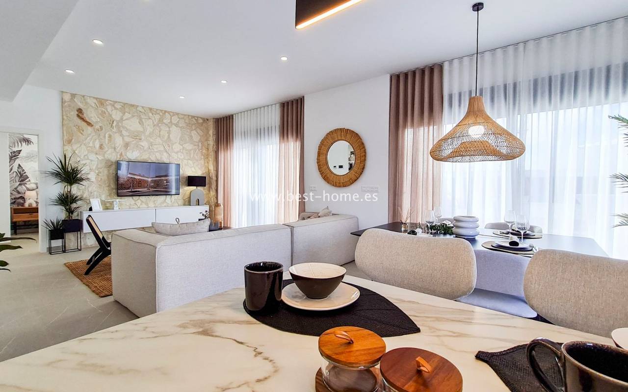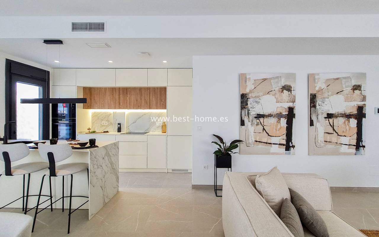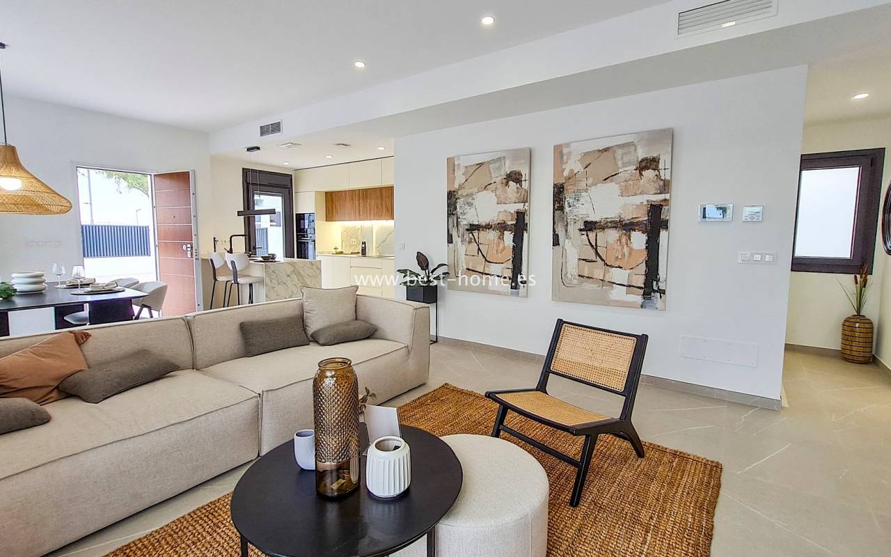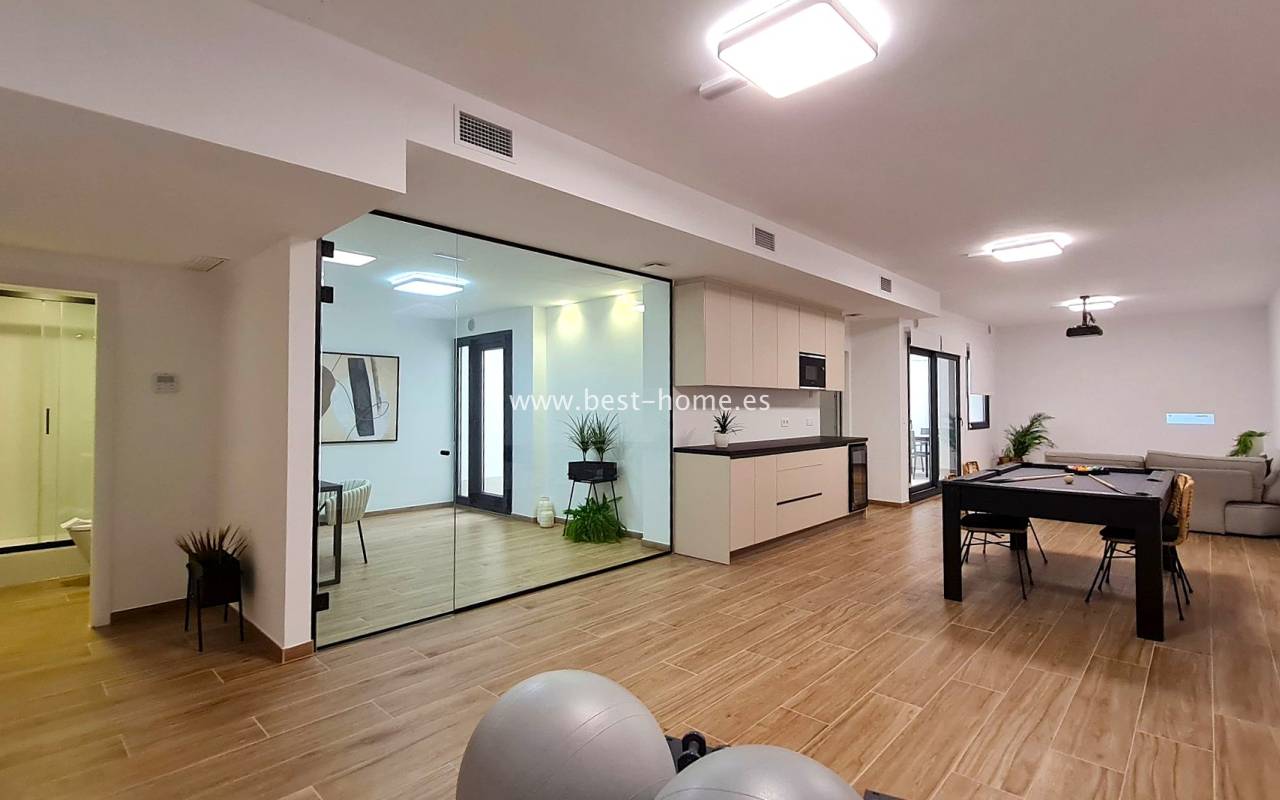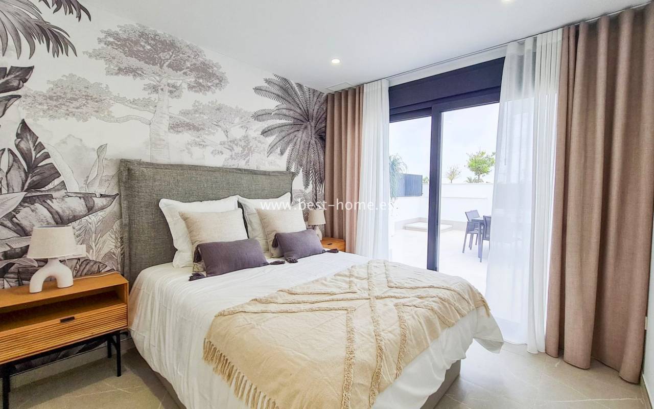Nowe, luksusowe wille budowane są w tym niesamowitym miejscu. Na parterze będzie przestronny i jasny salon połączony z jadalnią i umeblowaną kuchnią, jedna sypialnia i łazienką. Ze wszystkich pokoi będzie wyjście do ogrodu. Na piętrze odnajdziemy kolejne dwie sypialnie z łazienki en suit i taras. Kolejnymi schodami dostaniemy się na solarium/taras na dachu o powierzchni 33 m2. Z salonu dostaniemy się podpiwniczenia (61 m2) z wyjściem na patio (25 m2). W cenie zabudowa kuchenna wraz ze sprzętem AGD, elektryczne rolety zewnętrzne, dekoracyjne oświetlenie (schody, szafy, kuchnia), kompletne łazienki, podgrzewane podłogi w łazienkach, prywatny basen (z jacuzzi) ze słoną wodą, panele fotowoltaiczne i pre-instalacja centralnej klimatyzacji. Działki od od 252 m2 do 341 m2.