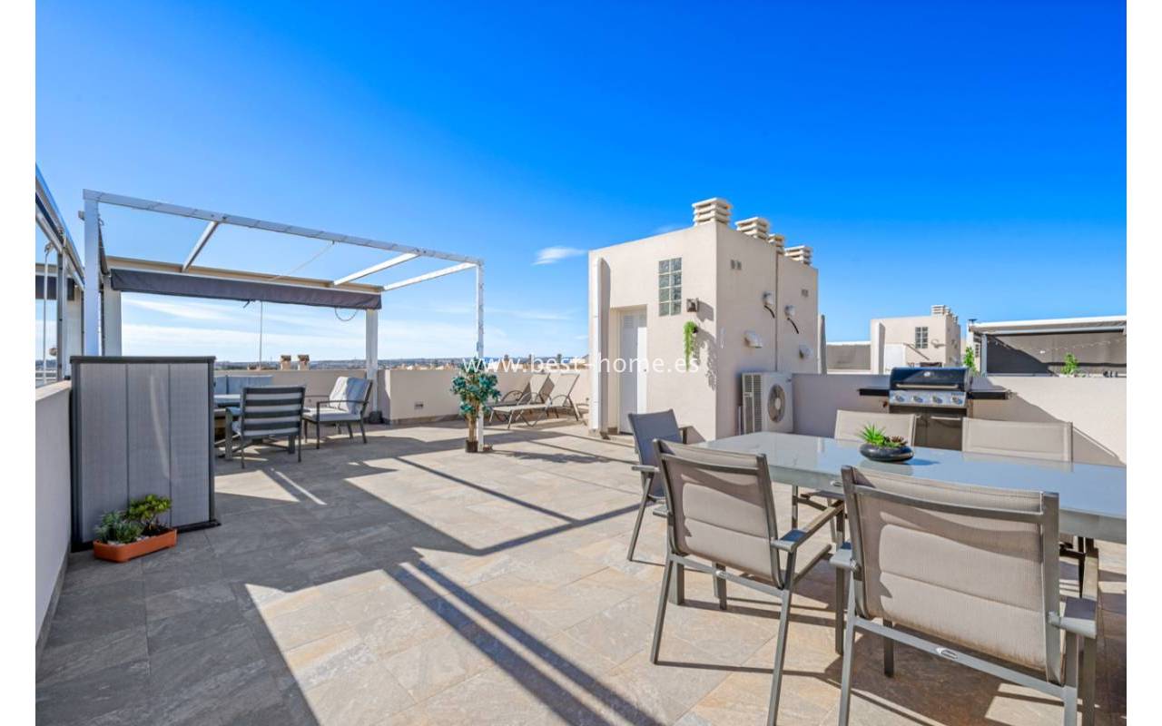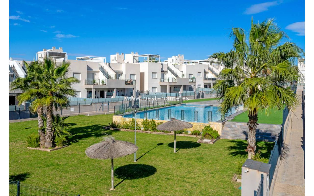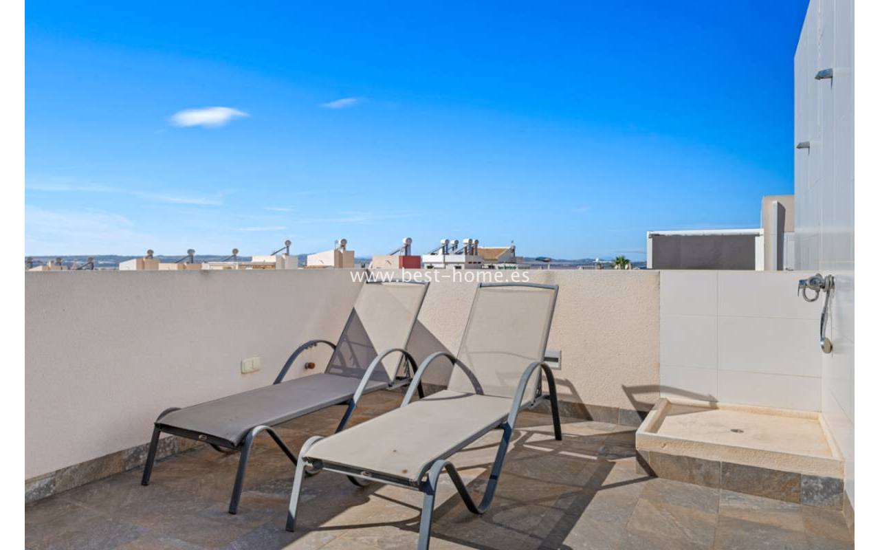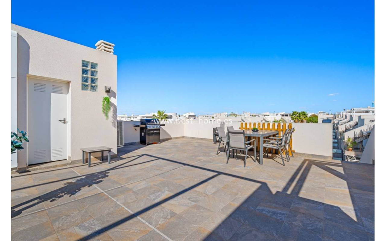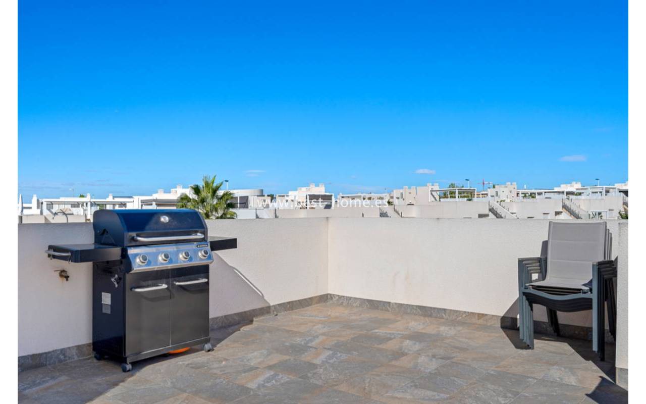 Nieruchomość znajduje się w Aguas Nuevas w Torrevieja na wybrzeżu Costa Blanca. To nowoczesny bungalow na piętrze z 2019 roku o powierzchni 78 m². Ma 2 sypialnie z wbudowanymi szafami i 2 łazienki, w tym jedną en suite. Salon z otwartą kuchnią jest jasny i ma wyjście na duży taras z widokiem na część wspólną i basen. Na dachu znajduje się duży prywatny taras słoneczny. Mieszkanie sprzedawane jest z umeblowaniem, posiada centralną klimatyzację oraz ogrzewanie podłogowe w łazienkach. W cenie jest prywatne miejsce parkingowe w garażu podziemnym. Osiedle jest ogrodzone i oferuje dwa baseny oraz jacuzzi, tereny zielone i plac zabaw. Blisko są sklepy, restauracje oraz plaża La Mata