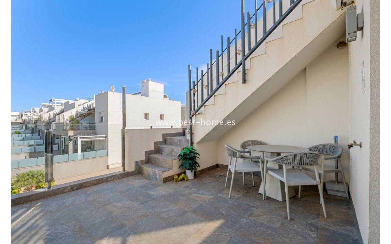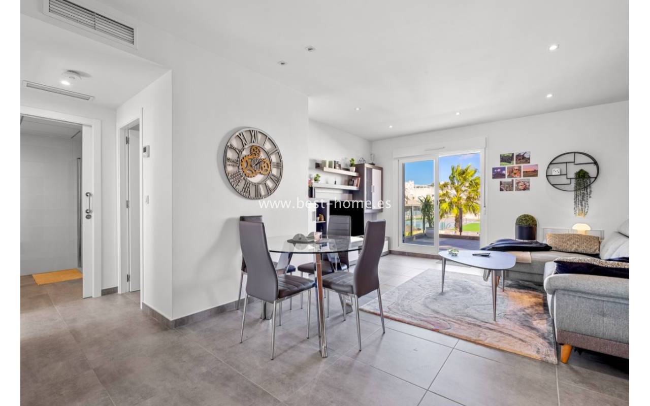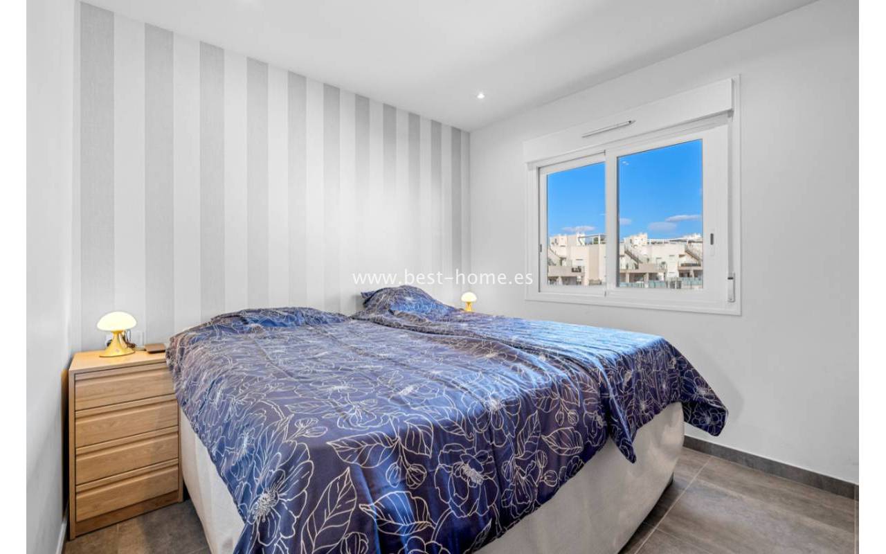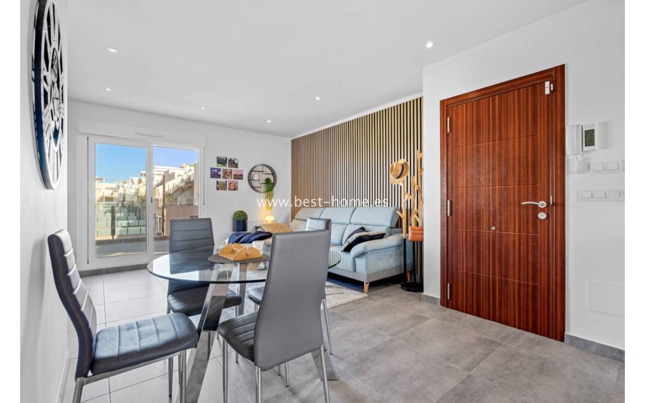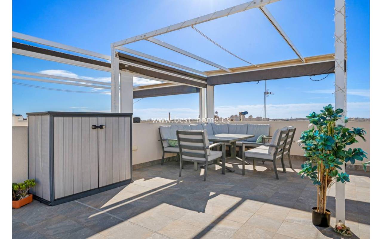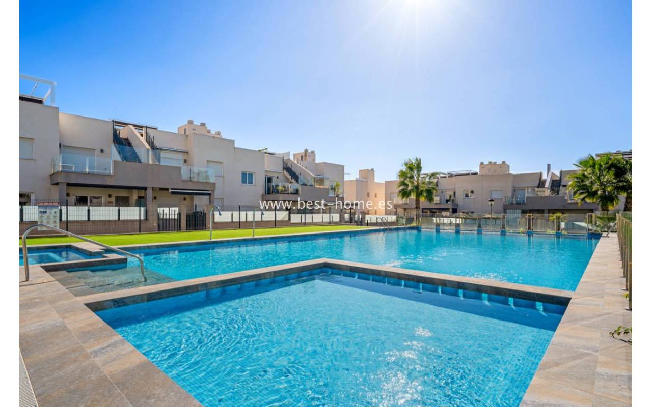 Nieruchomość znajduje się w Aguas Nuevas w Torrevieja na wybrzeżu Costa Blanca. To nowoczesny bungalow na piętrze z 2019 roku o powierzchni 78 m². Ma 2 sypialnie z wbudowanymi szafami i 2 łazienki, w tym jedną en suite. Salon z otwartą kuchnią jest jasny i ma wyjście na duży taras z widokiem na część wspólną i basen. Na dachu znajduje się duży prywatny taras słoneczny. Mieszkanie sprzedawane jest z umeblowaniem, posiada centralną klimatyzację oraz ogrzewanie podłogowe w łazienkach. W cenie jest prywatne miejsce parkingowe w garażu podziemnym. Osiedle jest ogrodzone i oferuje dwa baseny oraz jacuzzi, tereny zielone i plac zabaw. Blisko są sklepy, restauracje oraz plaża La Mata