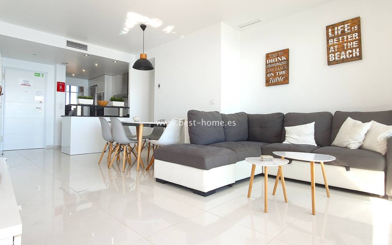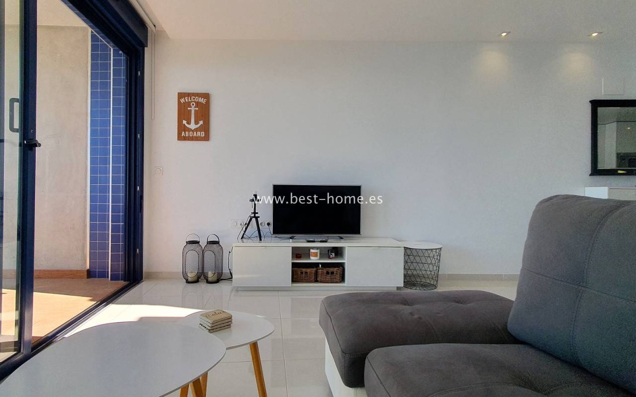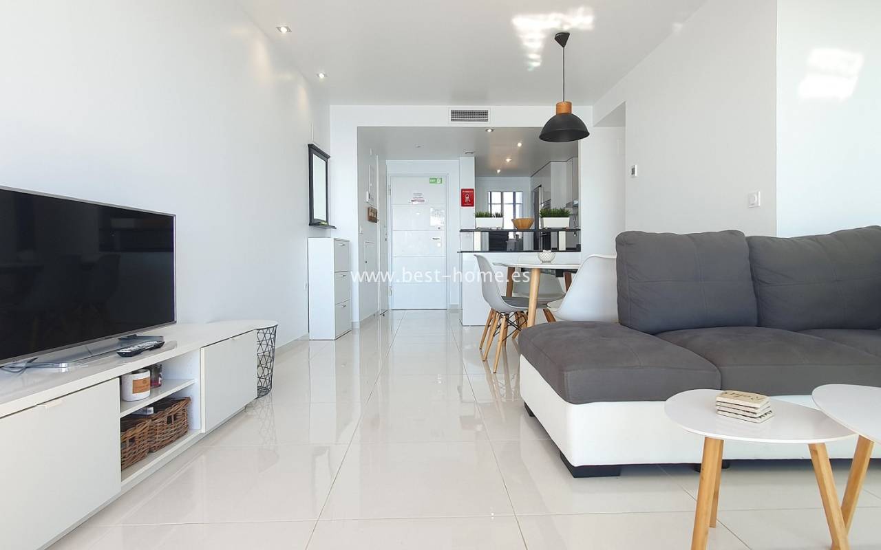 Po wejściu do apartamentu wita przestronny i jasny salon z jadalnią w otwartym układzie. Przesuwne drzwi od podłogi do sufitu prowadzą na dużą taras z panoramicznym widokiem na morze – idealne miejsce na poranną kawę, posiłki na świeżym powietrzu oraz niezapomniane śródziemnomorskie zachody słońca.