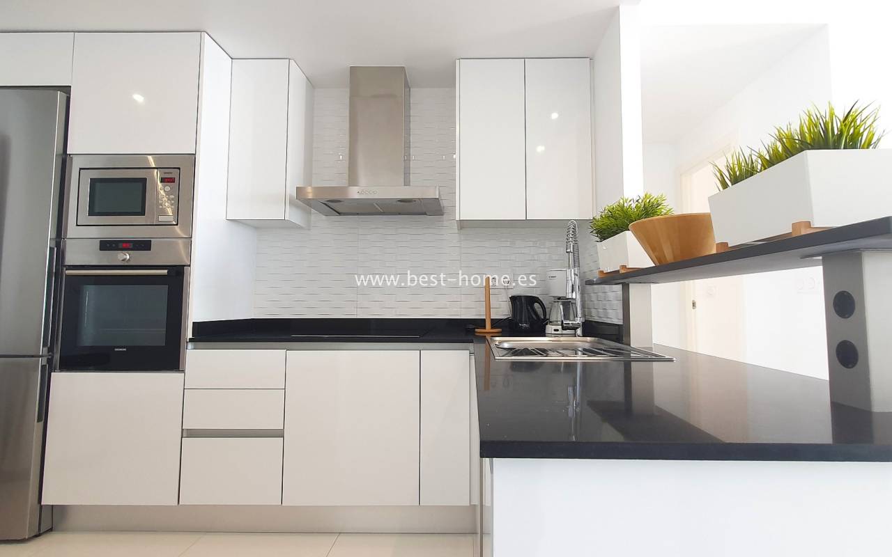 Kuchnia jest w pełni wyposażona w nowoczesny sprzęt AGD i harmonijnie połączona ze strefą dzienną, zapewniając komfort zarówno w codziennym użytkowaniu, jak i podczas przyjmowania gości. Dwie sypialnie mają przestronne rozmiary, w tym główną sypialnię typu master z prywatną łazienką i bezpośrednim wyjściem na taras, co gwarantuje wygodę i prywatność dla właścicieli oraz gości.