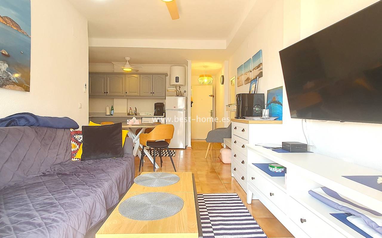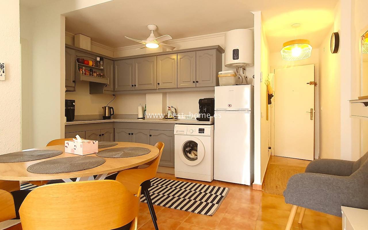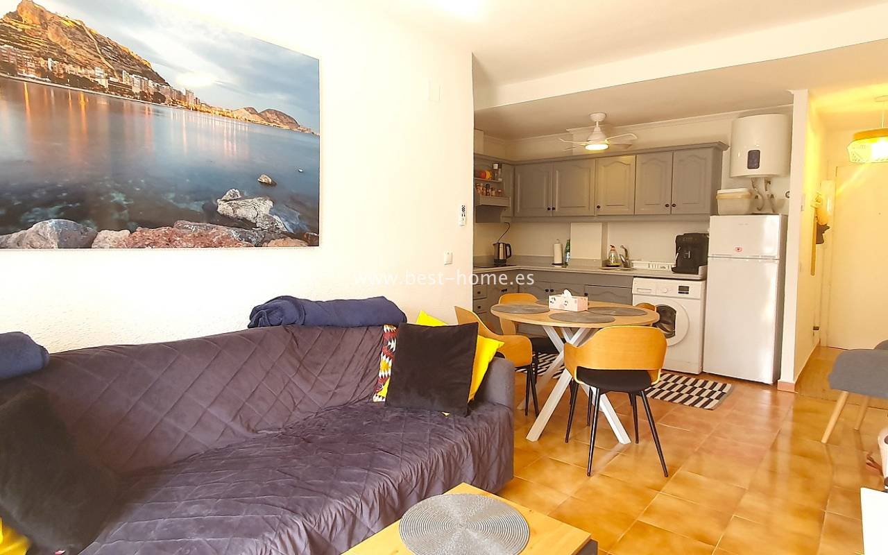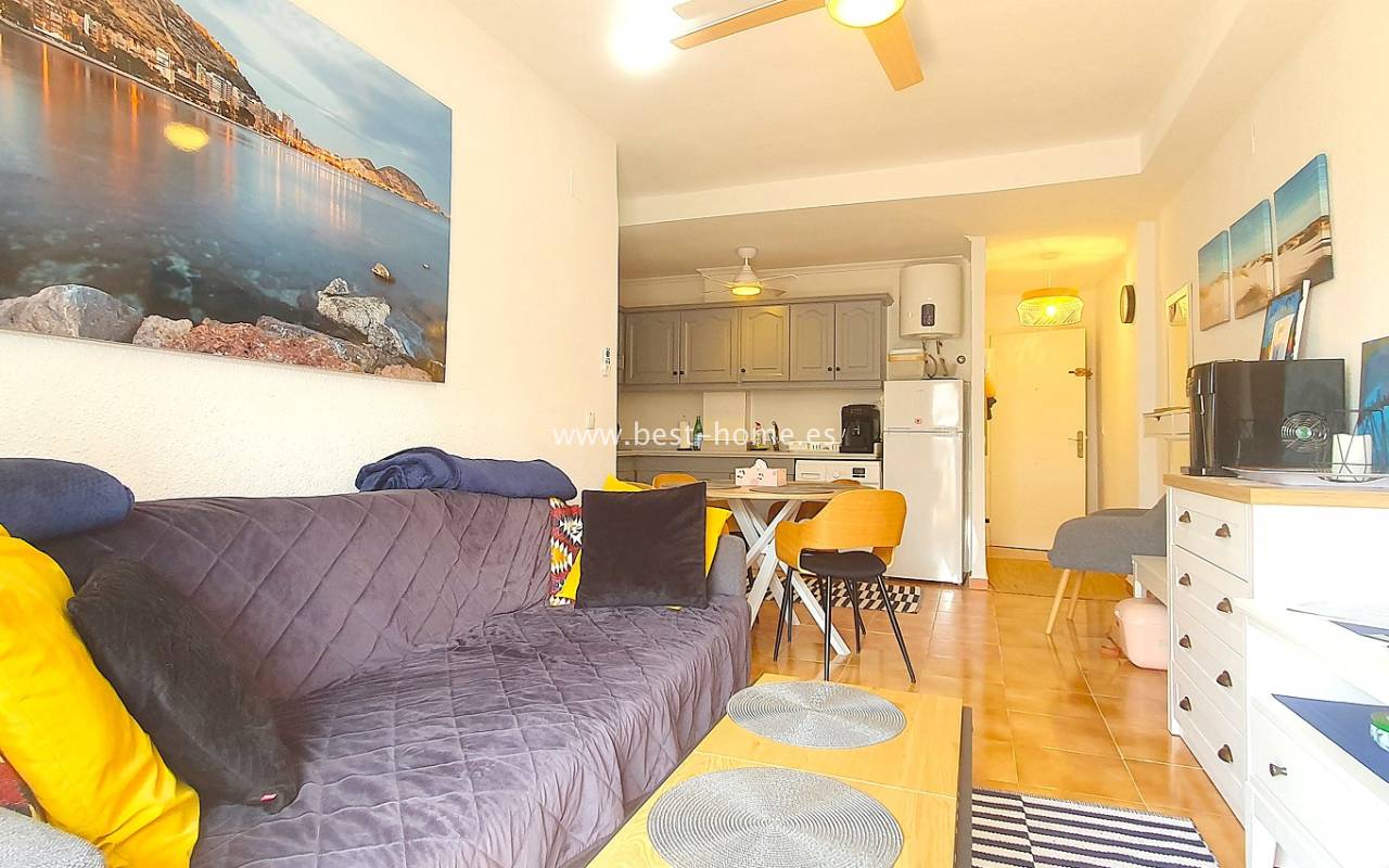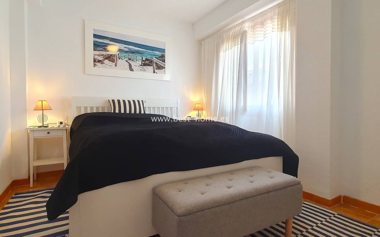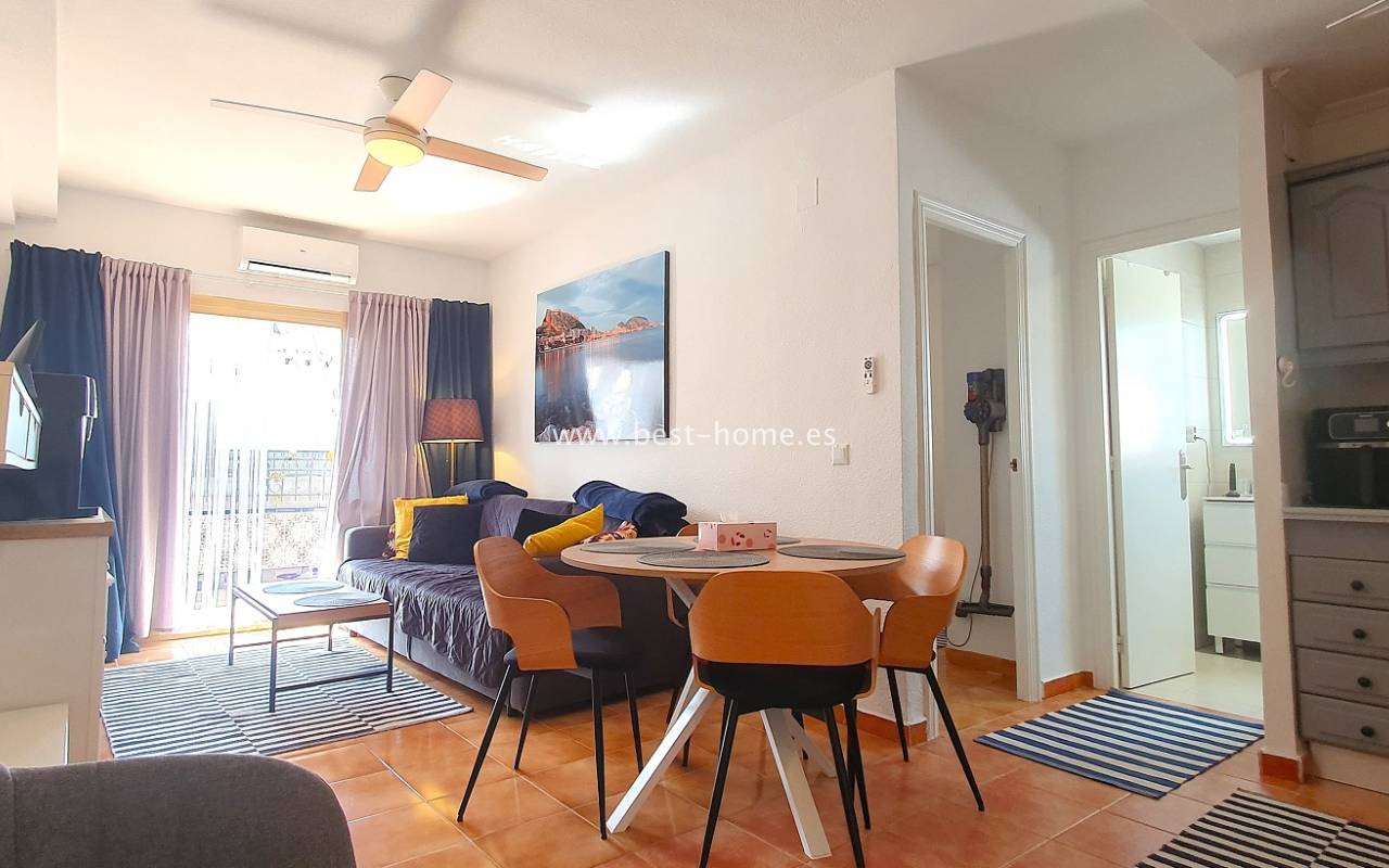 Ten atrakcyjny apartament położony jest na ładnym, hiszpańskim osiedlu w Santa Pola. Nieruchomość jest na 2 piętrze, składa się z umeblowanej kuchni, jednej sypialni z wbudowaną szafą, wyremontowanej łazienki i przestronnego salonu z jadalnią. Z salonu jest wyjście na słoneczny taras. Apartament zadbany, umeblowany, wyposażony z wentylatory sufitowe i klimatyzację. Nowa instalacja elektryczna. Na terenie osiedla jest wspólny basen i kort tenisowy.