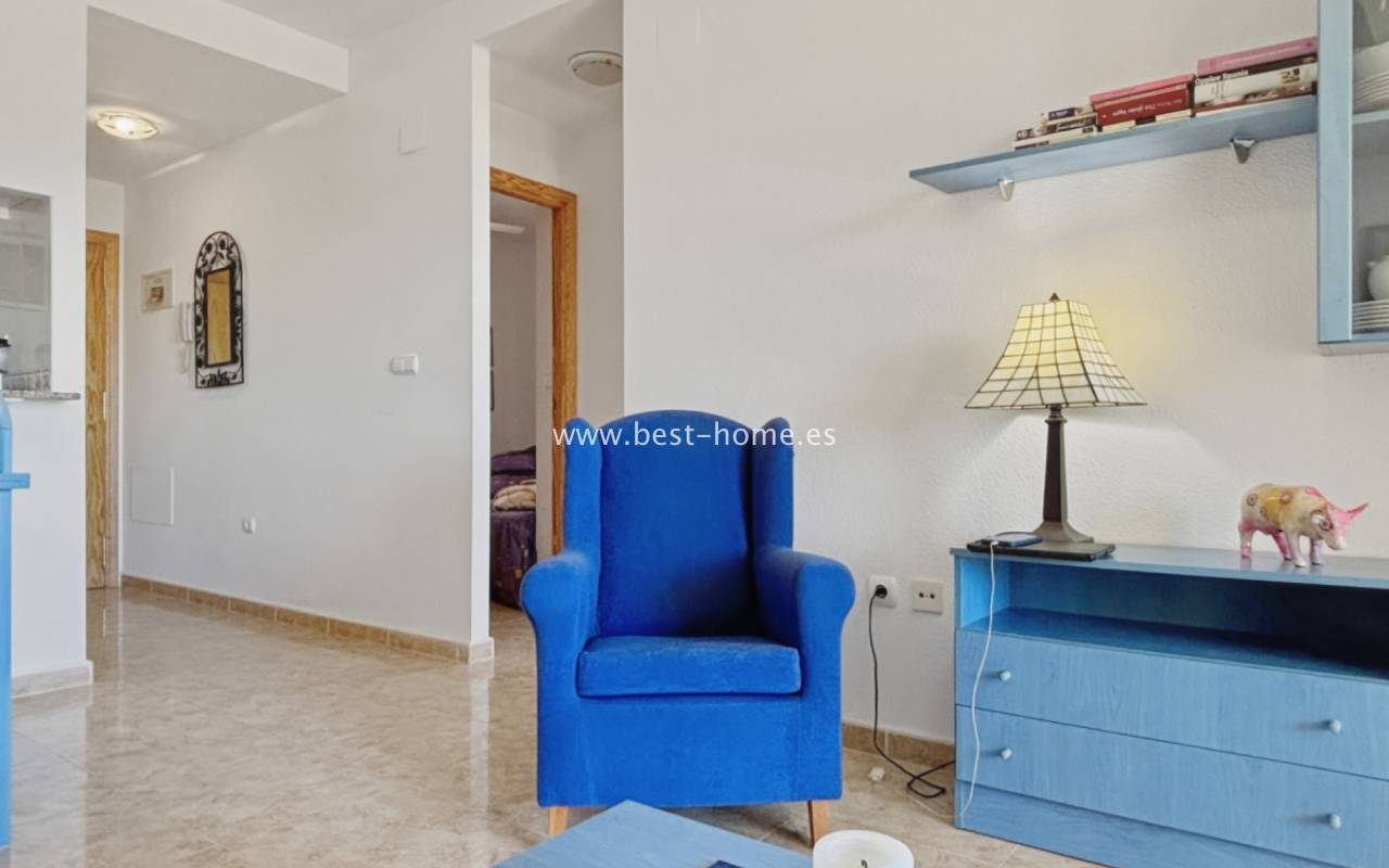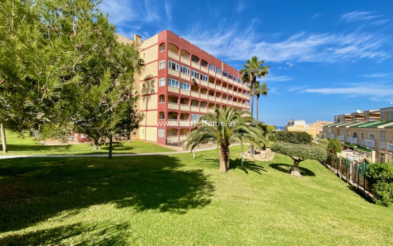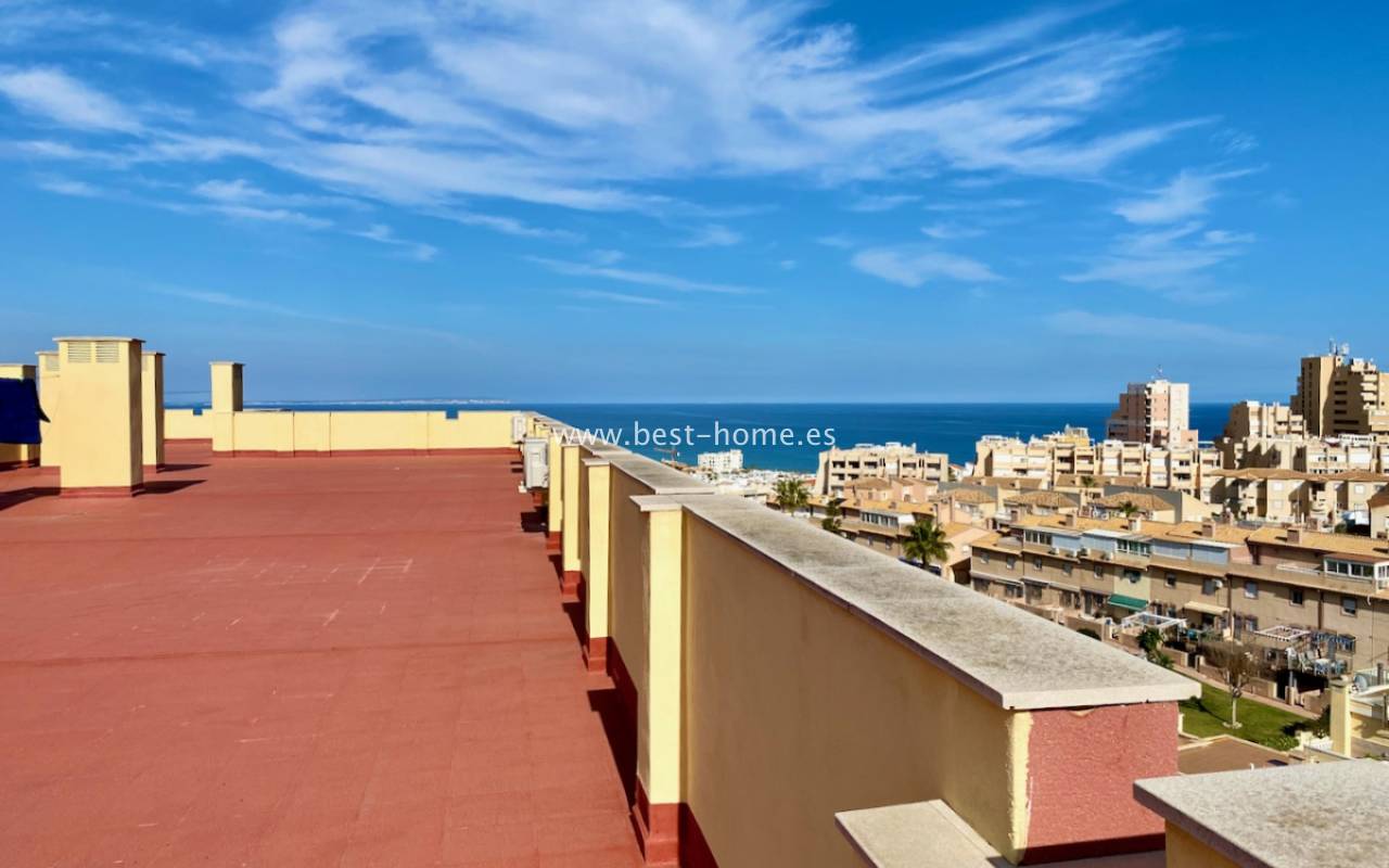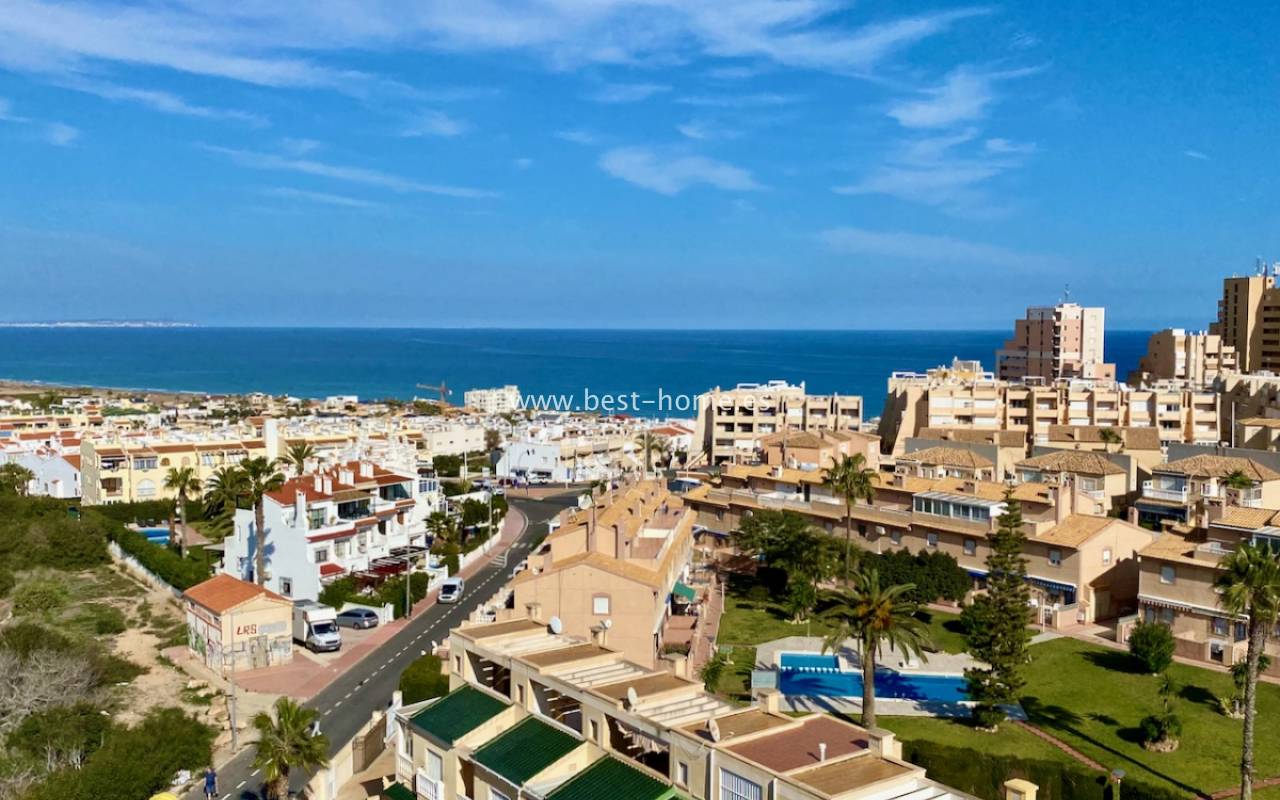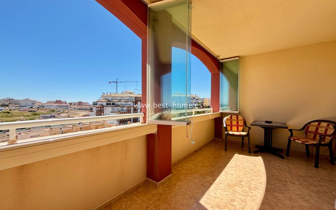 Fantastyczny apartament z zachwycającą panoramą Morza Śródziemnego oraz laguny solnej La Mata. Nieruchomość znajduje się zaledwie 710 metrów od plaży, w otoczeniu pełnej infrastruktury, sklepów, restauracji i usług dostępnych w kilka minut spacerem. Mieszkanie usytuowane jest na czwartym piętrze zadbanego, zamkniętego osiedla z rozległymi terenami zielonymi oraz dużym basenem przeznaczonym dla mieszkańców. Lokal narożny, położony na najwyższej kondygnacji, o ekspozycji południowo-wschodniej, dzięki czemu jest bardzo jasny i słoneczny przez cały dzień. Wnętrze obejmuje nowoczesną kuchnię typu amerykańskiego, w pełni wyposażoną i połączoną z częścią jadalnianą oraz salonem. Z salonu prowadzi wyjście na przestronny taras, z którego rozciągają się imponujące widoki. Taras wyposażono w system przeszkleń, który umożliwia jego zamknięcie lub otwarcie w zależności od pory roku i potrzeb. Dodatkowo w apartamencie znajdziemy dwie dwuosobowe sypialnie, wyposażóą łazienkę z oknem. Budynek posiada windy, a na dachu znajduje się duży taras wspólny, idealny do opalania i podziwiania rozległych widoków na okolicę.