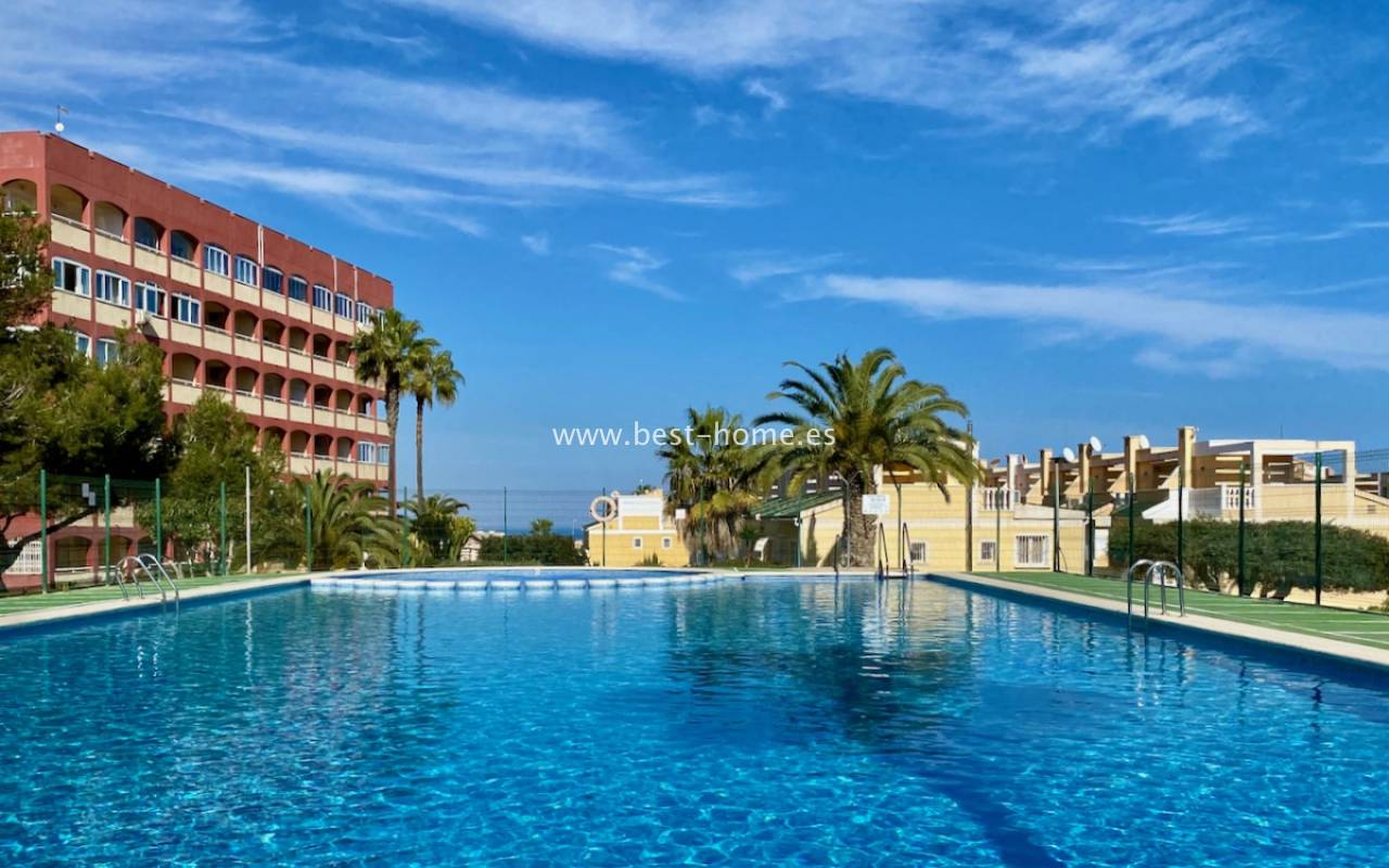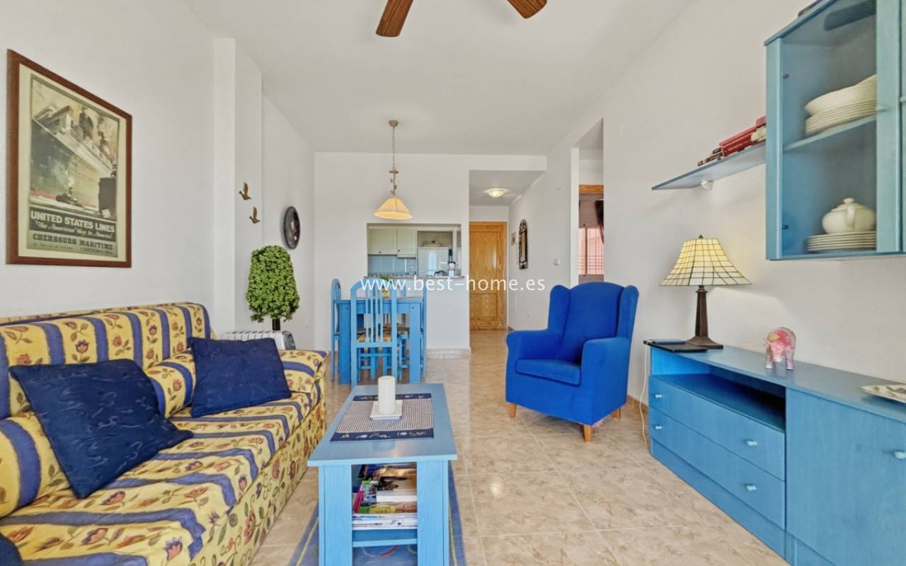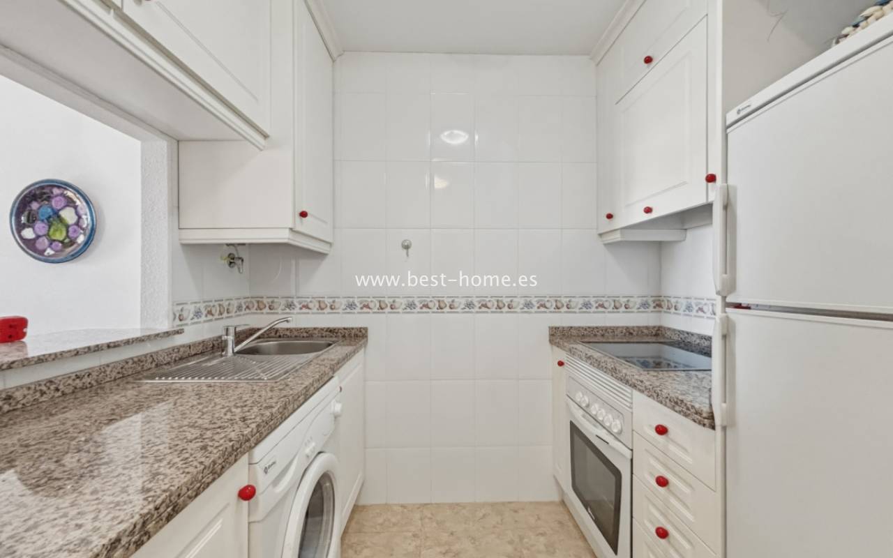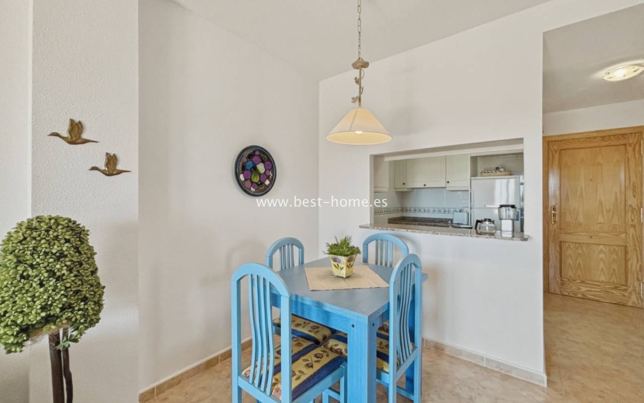 Fantastyczny apartament z zachwycającą panoramą Morza Śródziemnego oraz laguny solnej La Mata. Nieruchomość znajduje się zaledwie 710 metrów od plaży, w otoczeniu pełnej infrastruktury, sklepów, restauracji i usług dostępnych w kilka minut spacerem. Mieszkanie usytuowane jest na czwartym piętrze zadbanego, zamkniętego osiedla z rozległymi terenami zielonymi oraz dużym basenem przeznaczonym dla mieszkańców. Lokal narożny, położony na najwyższej kondygnacji, o ekspozycji południowo-wschodniej, dzięki czemu jest bardzo jasny i słoneczny przez cały dzień. Wnętrze obejmuje nowoczesną kuchnię typu amerykańskiego, w pełni wyposażoną i połączoną z częścią jadalnianą oraz salonem. Z salonu prowadzi wyjście na przestronny taras, z którego rozciągają się imponujące widoki. Taras wyposażono w system przeszkleń, który umożliwia jego zamknięcie lub otwarcie w zależności od pory roku i potrzeb. Dodatkowo w apartamencie znajdziemy dwie dwuosobowe sypialnie, wyposażóą łazienkę z oknem. Budynek posiada windy, a na dachu znajduje się duży taras wspólny, idealny do opalania i podziwiania rozległych widoków na okolicę.